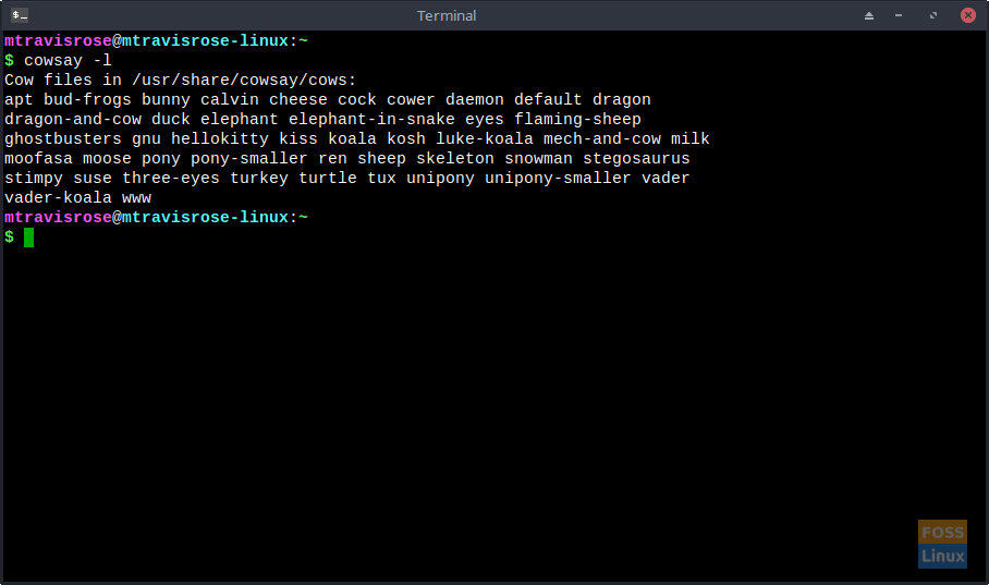 cowsay -f stegosaurus …fosslinux.com is a great site!