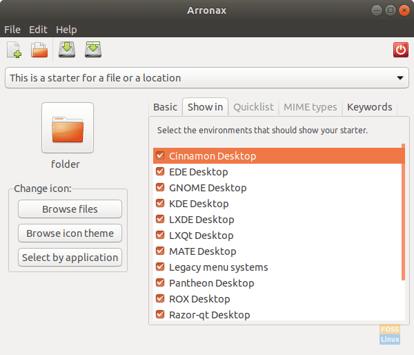 The ‘Show in‘ tab is used to specify in which desktop environments the newly created application must appear. All are checked, and that is probably how you want it. Generally, the systems have only one desktop environment, so this option doesn’t require much tinkering.