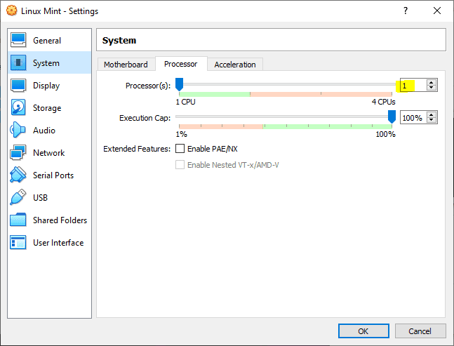 Click on “System” → “Processor” and choose how many CPU cores you want to allocate to the virtual machine. By default, it has one core, but if you want more power, you can increase it to half of the total cores available.
